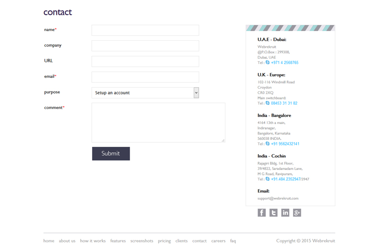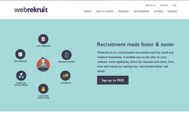 Webrekruit is a new cloud based recruitment software for businesses & corporate to list job openings, track applicants, manage & short list resumes online. The site is given a unique interface which makes all interactions user friendly.