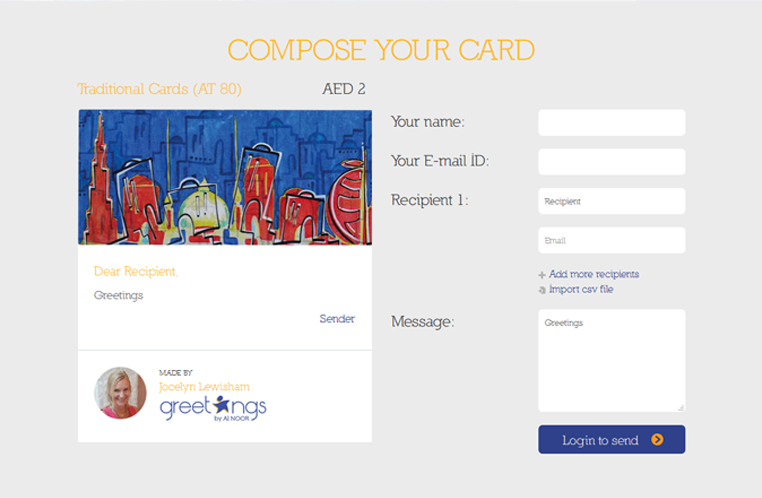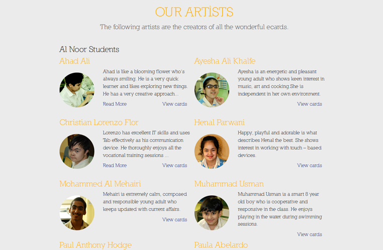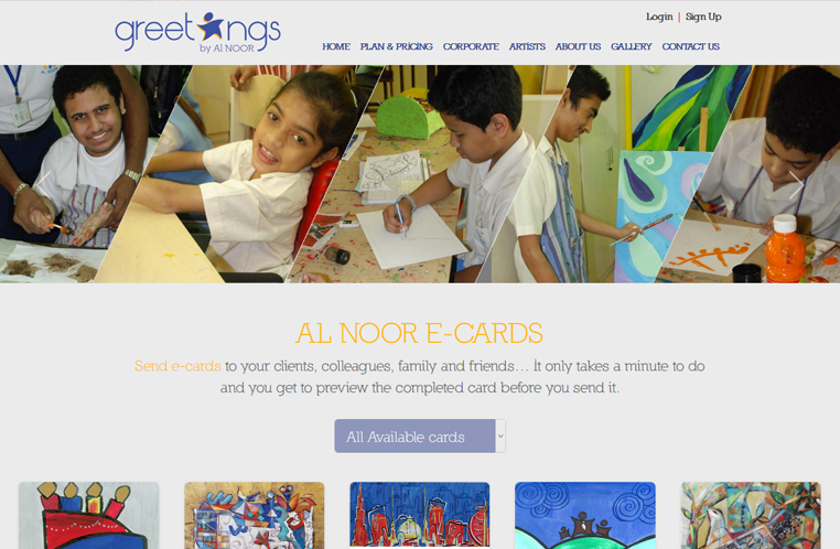 The website features an extensive collection of electronic cards designed by the students of Al Noor with contributions from local artists. Customers can sign up for a membership type and plan, select the e-card that suits the occasion, personalize the greetings or even customize it and then send it via e-mail.